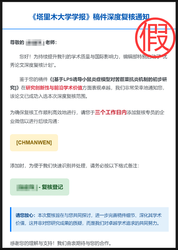 近期,本刊接到部分编委与作者反馈:有不法分子冒充本刊编辑部人员,以“稿件深度复核”“补充作者信息”为由实施诈骗(具体方式如下图所示)。我刊唯一官方邮箱账号为tlmdxxb@163.com,若您遇到此类情况,请务必不予理会、切勿相信,谨防上当受骗!